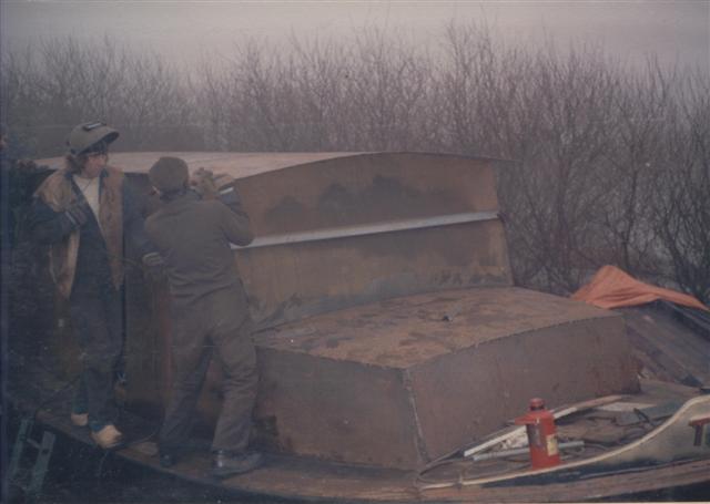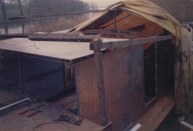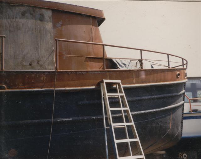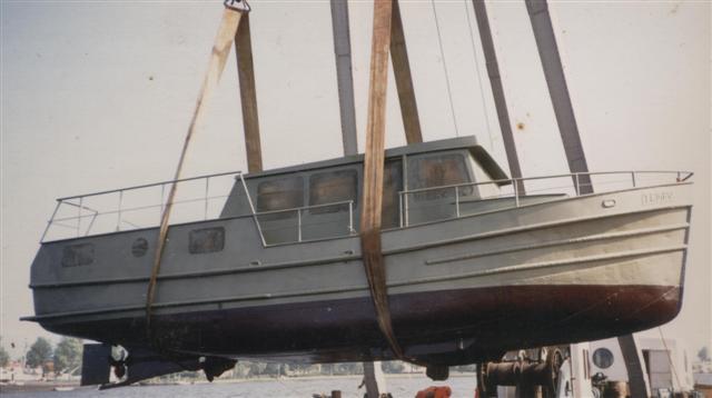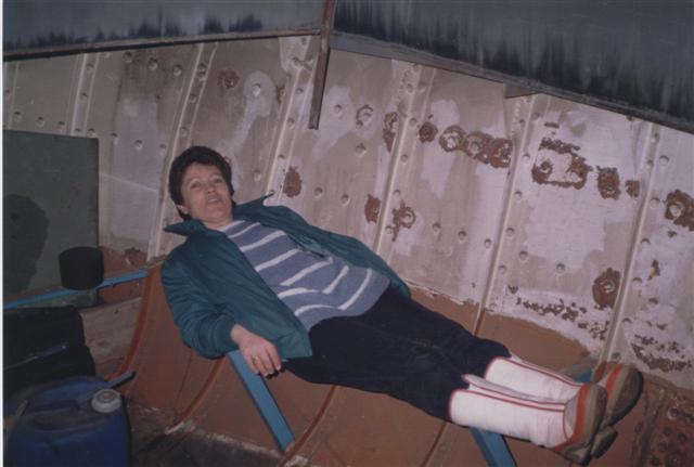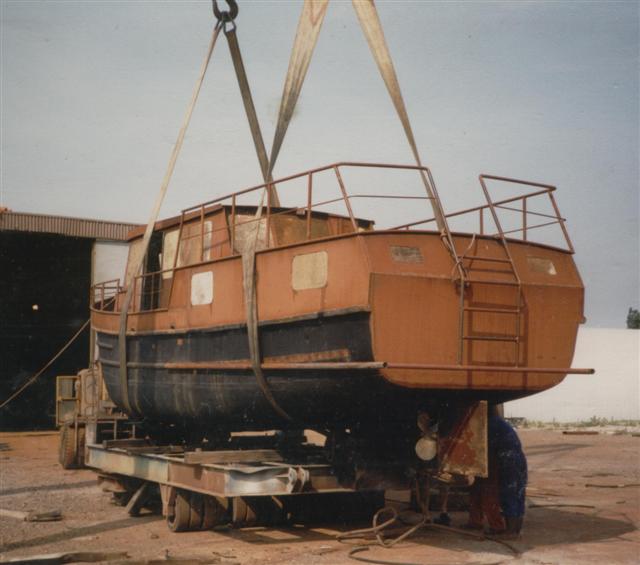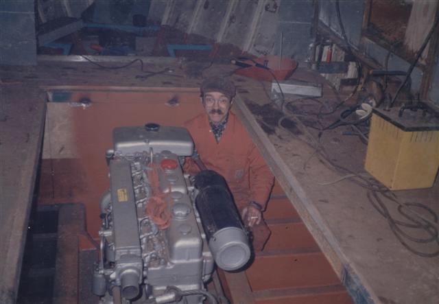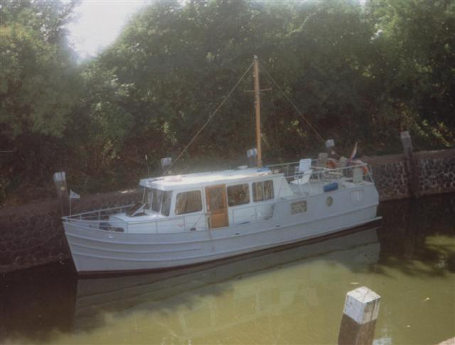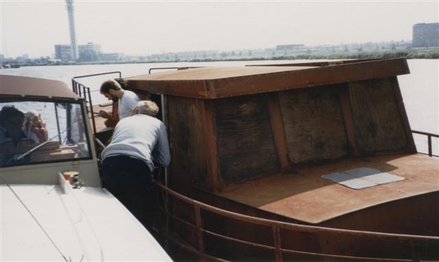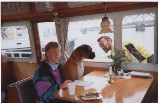 In de stuurhut aan tafel, zoonlief met de hond, Karel staat buiten.